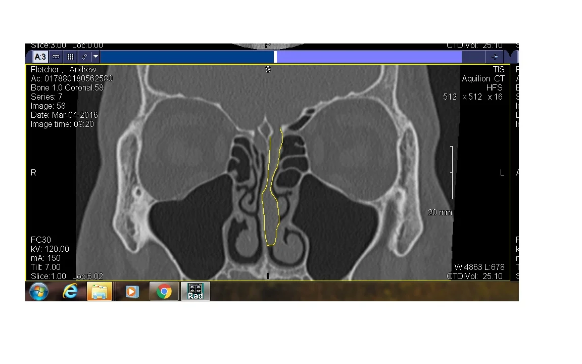On the radiographs, it looks like a mass. Here is a clip of the MRI. I outlined the tumor in yellow. You can see that I outlined it as it hangs down from the roof of my sinus. If you look at the little yellow arrow, it points to a curvy dark black space that rides alongside the middle of my sinuses. That dark black space is my airway on the right sinus.